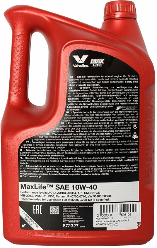 VALVOLINE 872295 Масо Valvoline MAXLIFE 10W40 1