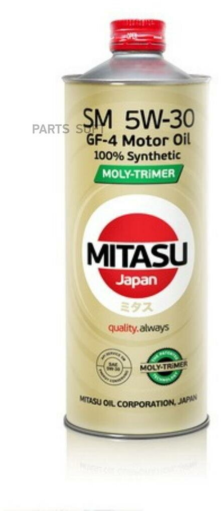 Лучшие цены. MITASU MOLY-TRiMER SM 5W-30 ILSAC GF-4 100% Synthetic – полностью синтетическое моторное масло, изготовленное с применением пакета присадок, произведенного по новейшей технологии «MOLY-TRiMER». Полностью растворимые соединения органического молибдена, входящие в состав пакета «MOLY-TRiMER», способствуют заполнению структурных дефектов поверхностного слоя металла трущихся поверхностей, образуя сверхтонкую смазывающую пленку, обладающую низким коэффициентом трения. Цвет продукта зеленый. Магазины в вашем городе.