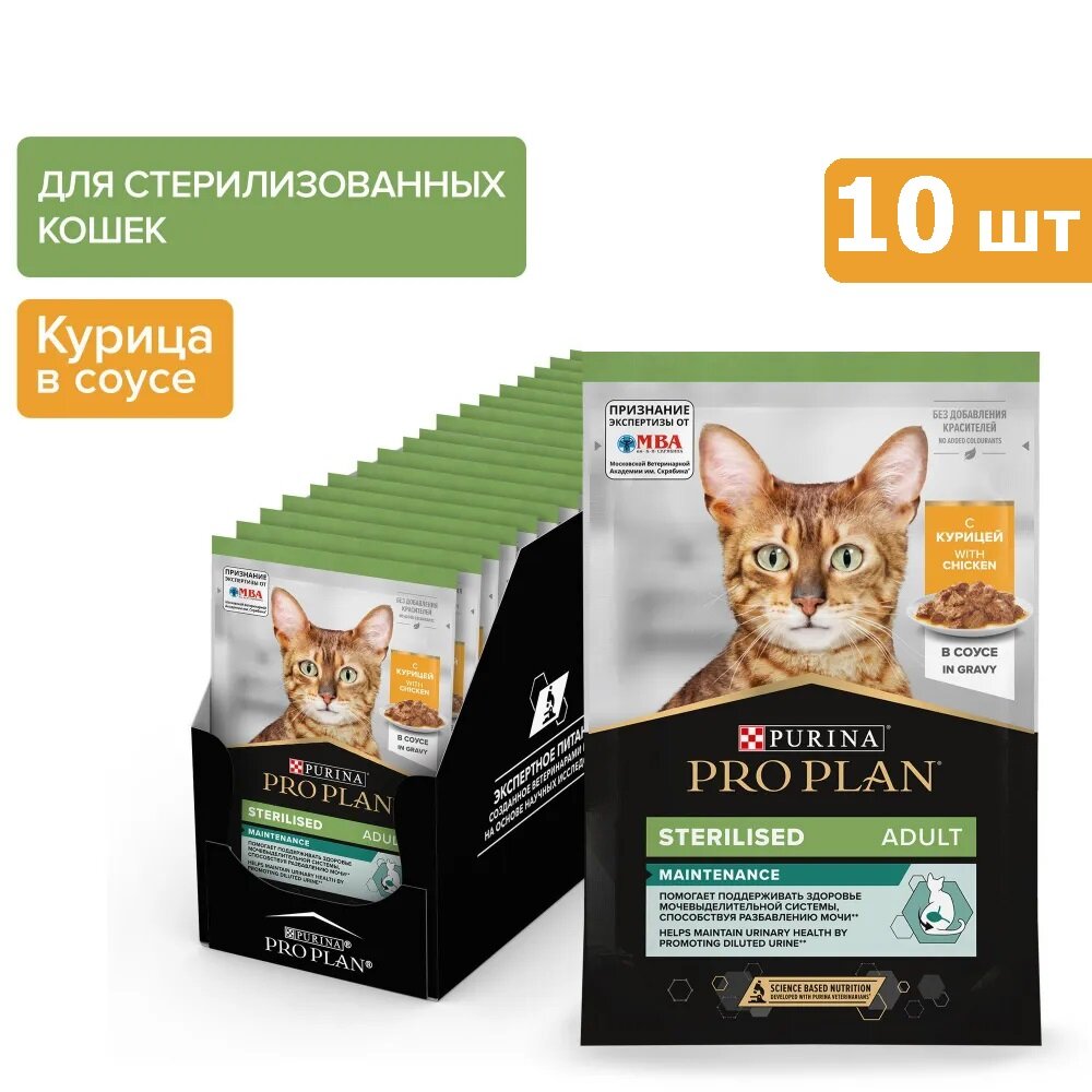 Pro Plan Влажный корм для взрослых стерилизованных кошек и кастрированный котов, с курицей в соусе, пауч 85 г, 9 штук
