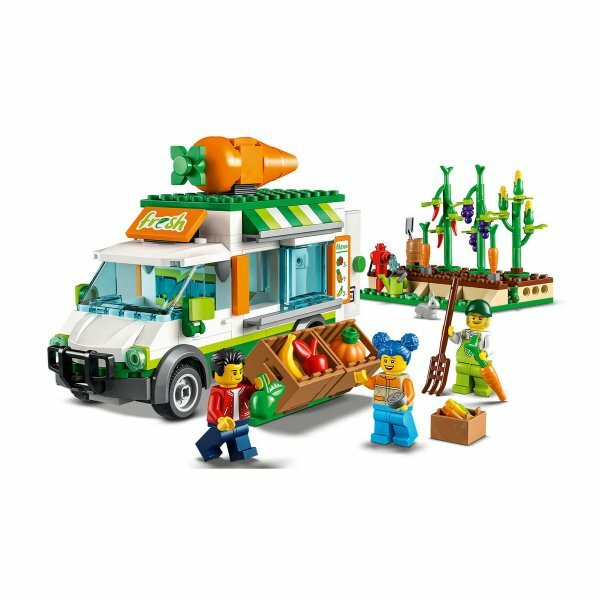 Лучшие цены. Ура! Фургончик фермерского рынка открыт для работы с большим количеством свежих фруктов и овощей. Помогите фермеру полить и собрать урожай моркови, кукурузы, халапеньо и винограда. Загрузите ящики для аппетитной демонстрации, запрыгните на борт передвижного магазина и подавайте овощи через раздвижное окно. Присоединяйся к Горацию и друзьям из LEGO City TV для доставки продуктов на дом и веселья в деревне - но следи за голодным кроликом. Магазины в вашем городе.