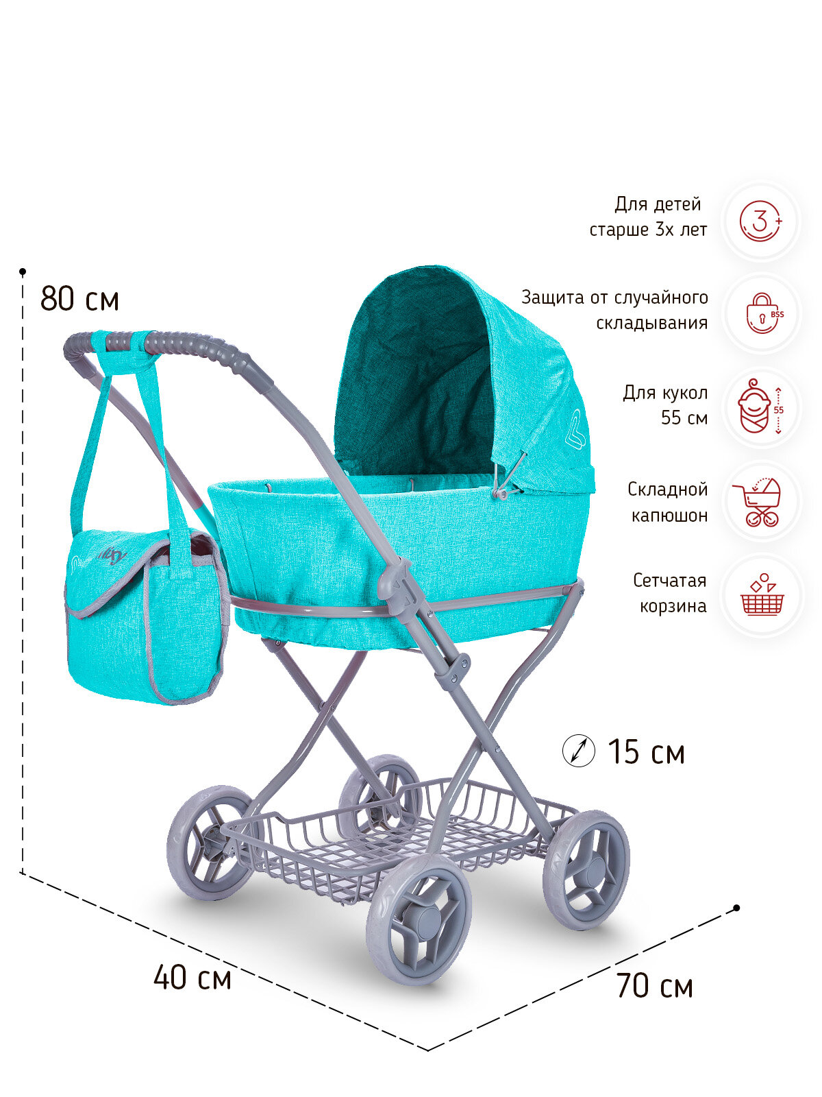 Коляска для куклы Buggy Boom Mixy регулируемый капюшон, сумка, сетка для игрушек, бирюзовая 69х40х80 см 8019-0625 3 790 ₽ Подробнее
