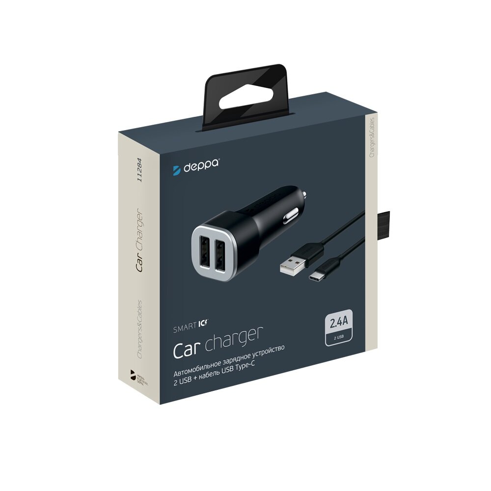 Автомобильное зарядное устройство АЗУ 2USB + кабель Type-C Deppa (11284) 2 USB 2.4А черный