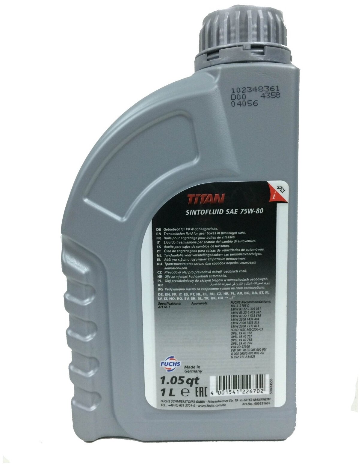 Трансмиссионное масло Fuchs 600631697 Масло трансмиссионное синтетическое "TITAN SINTOFLUID 75W-80", 1л