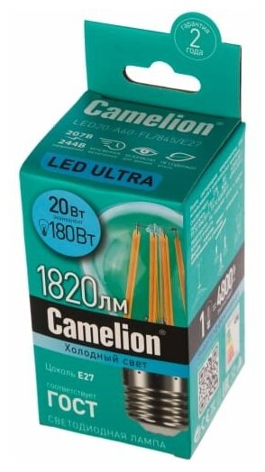 LED лампа груша прозрачная Filament 20Вт Е27 4500К(холодный белый свет) размер Ф60х105мм - LED20-A60-FL/845/E27 (Camelion) (код заказа 17216 И ) 318 ₽ Подробнее