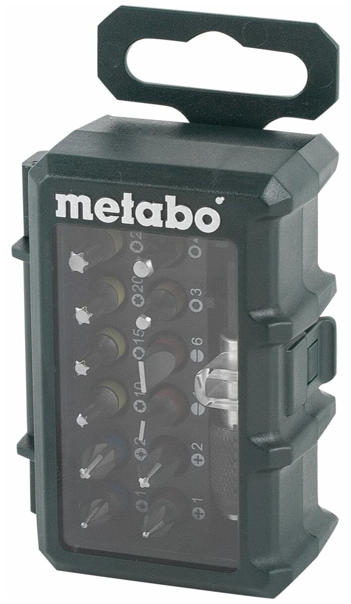 Лучшие цены. Официальный дилер Metabo. Состоит из: S 2Длина = 25 мм (14 штук): по 1 x: PH 1, PH 2, PZ 1, PZ 2, SL 4, SL 6, H 3, H 4, H 5, T 10, T 15, T 20, T 25, T 30,1 магнитный держатель насадокИнструментальные насадки из хромованадиевой стали (качество S2), насадки с условной окраской: для быстрого и простого нахождения подходящей инструментальной насадки, магнитный быстросменный угловой адаптер, высококачественный прочный футляр специального дизайна Metabo, съемное крепление с отверстием евростандарта. Магазины в вашем городе.