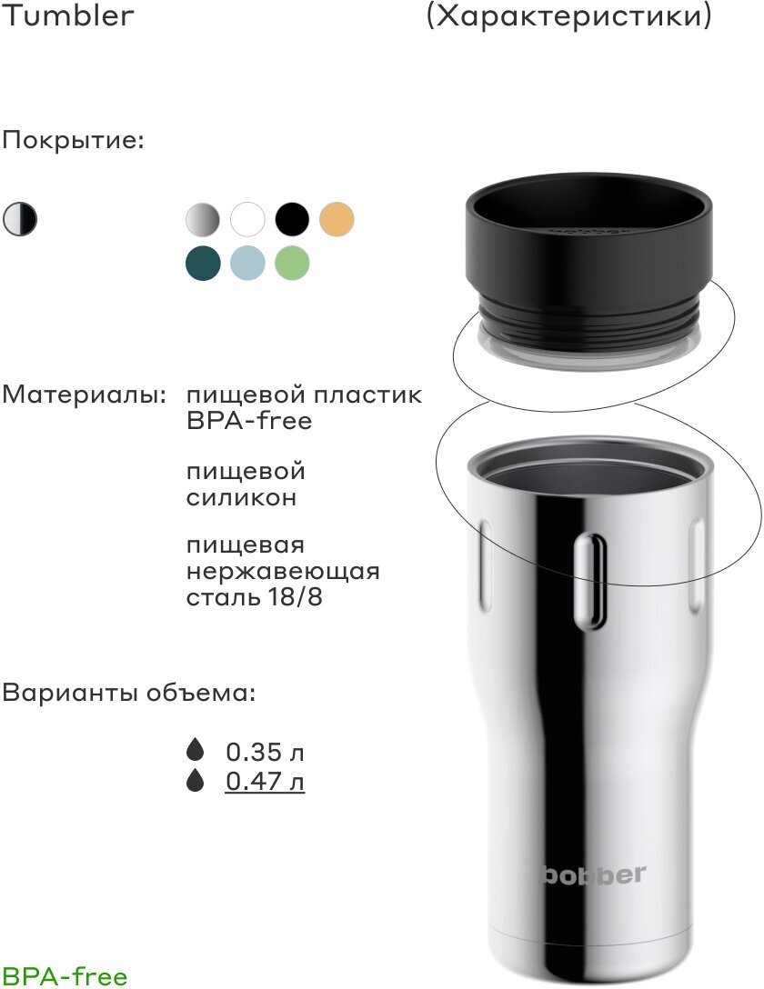 Термос питьевой, вакуумный, бытовой, тм bobber. Объем 0,47 литра. Артикул Tumbler-470 Matte 8 137 ₽ Подробнее