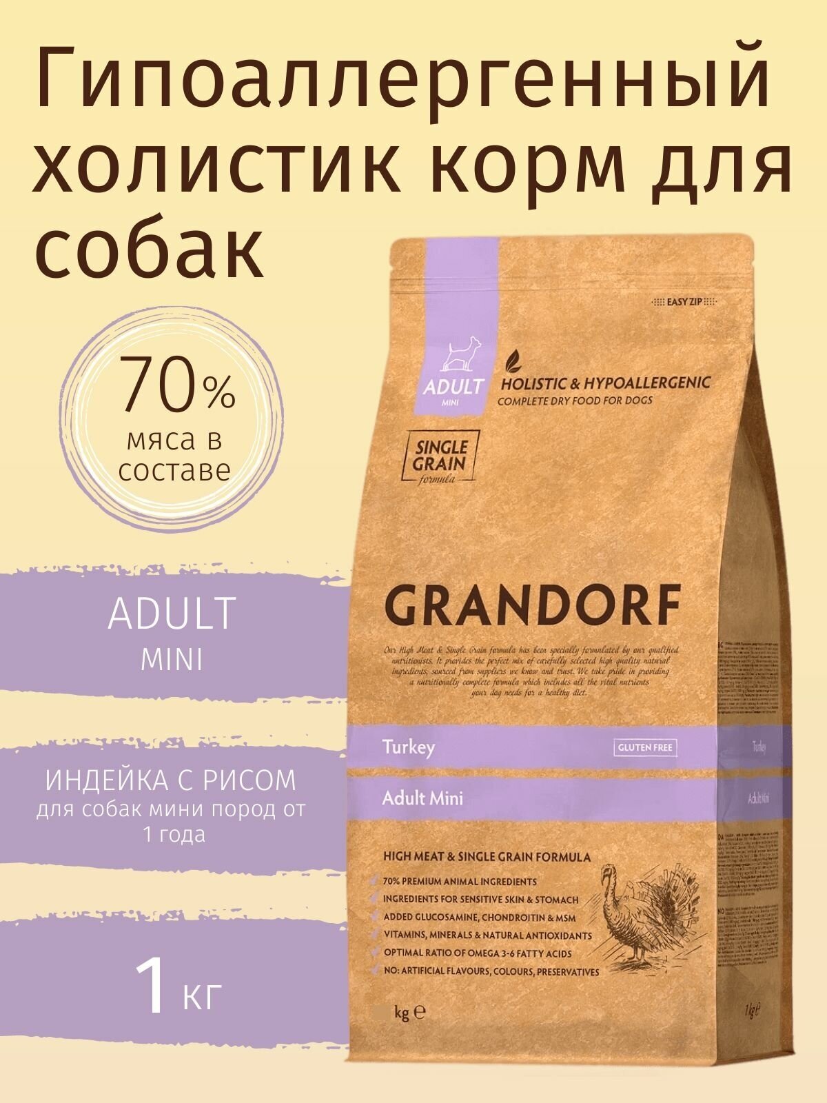 GRANDORF SINGLE GRAIN DOG ADULT MINI TURKEY низкозерновой для взрослых собак маленьких пород с индейкой (1 + 1 кг)