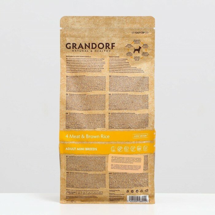 GRANDORF SINGLE GRAIN DOG ADULT MINI 4 MEAT RECIPE низкозерновой для взрослых собак маленьких пород 4 вида мяса с ягненком, индейкой, уткой и кабаном (3 + 3 кг)