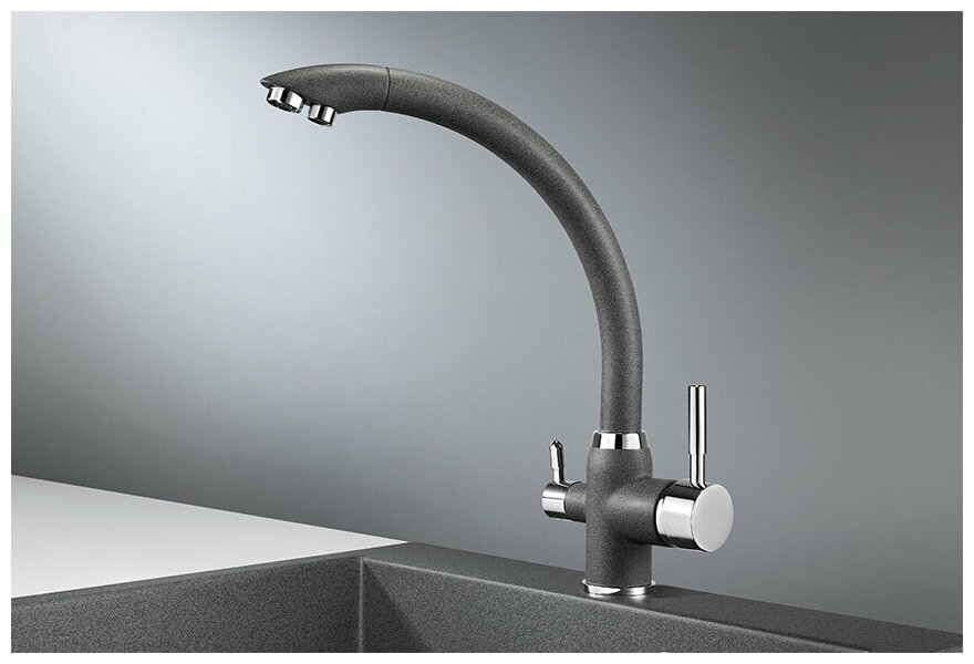 Лучшие цены. Однорычажный смеситель для кухни Granula GR-2167. Цвет: графит. Привлекательный дизайн изделия дополняет максимальная функциональность, высокая надежность и бесшумная работа на протяжении всего срока эксплуатации. Превосходно дополнит интерьер любой кухни в современном стиле. - Изготовлен из высококачественной латуни с покрытием под искусственный камень. - Керамический картридж обеспечивает точную настройку температуры и напора воды. - Дополнительный кран для подключения фильтра с питьевой водой. Магазины в вашем городе.