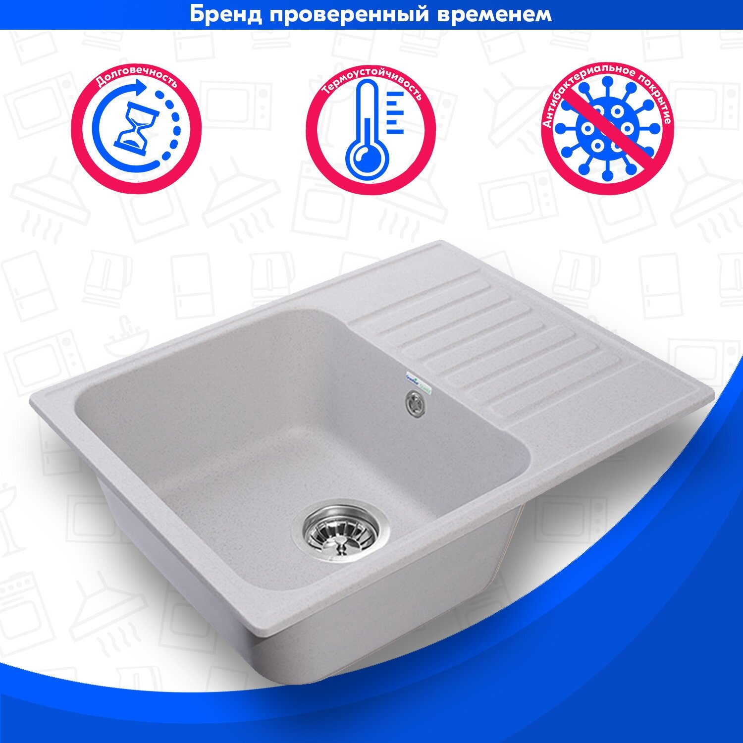 Мойка для кухни врезная каменная GranFest Quarz GF-Z13, цвет белый, с крылом, прямоугольная, 618х477х180 мм