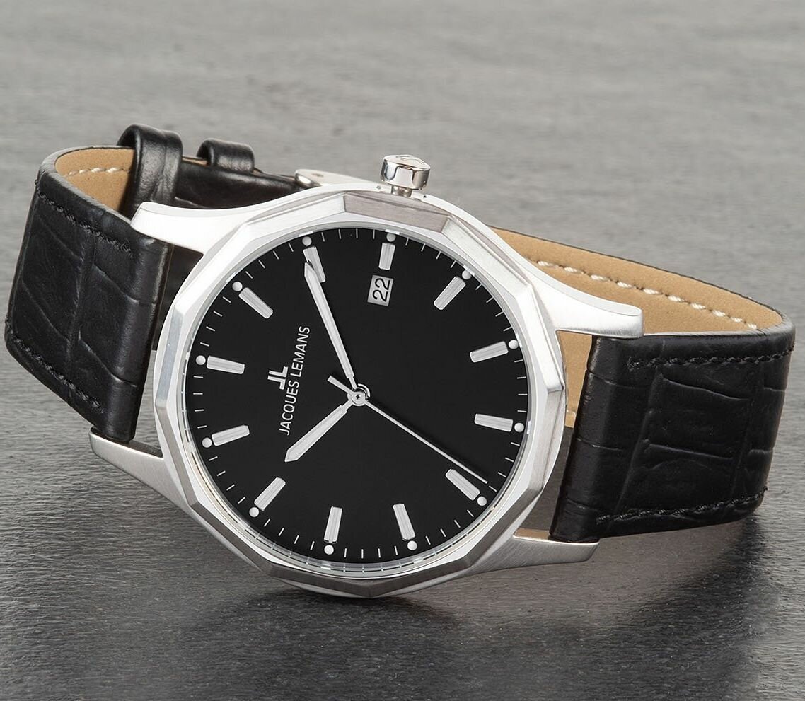 Лучшие цены. Часы наручые Jacques Lemans 1-2010A. Кварцевые мужские часы классической серии Jacques Lemans отличаются 12-гранной формой безеля. Его грани прекрасно дополняют круглый стальной корпус часов. На полированном циферблате черного цвета размещены часовая и минутная стрелка мечевидной формы, секундная стрелка и апертура даты. Модель дополняет черный ремешок из натуральной кожи с прошивкой. Магазины в вашем городе.