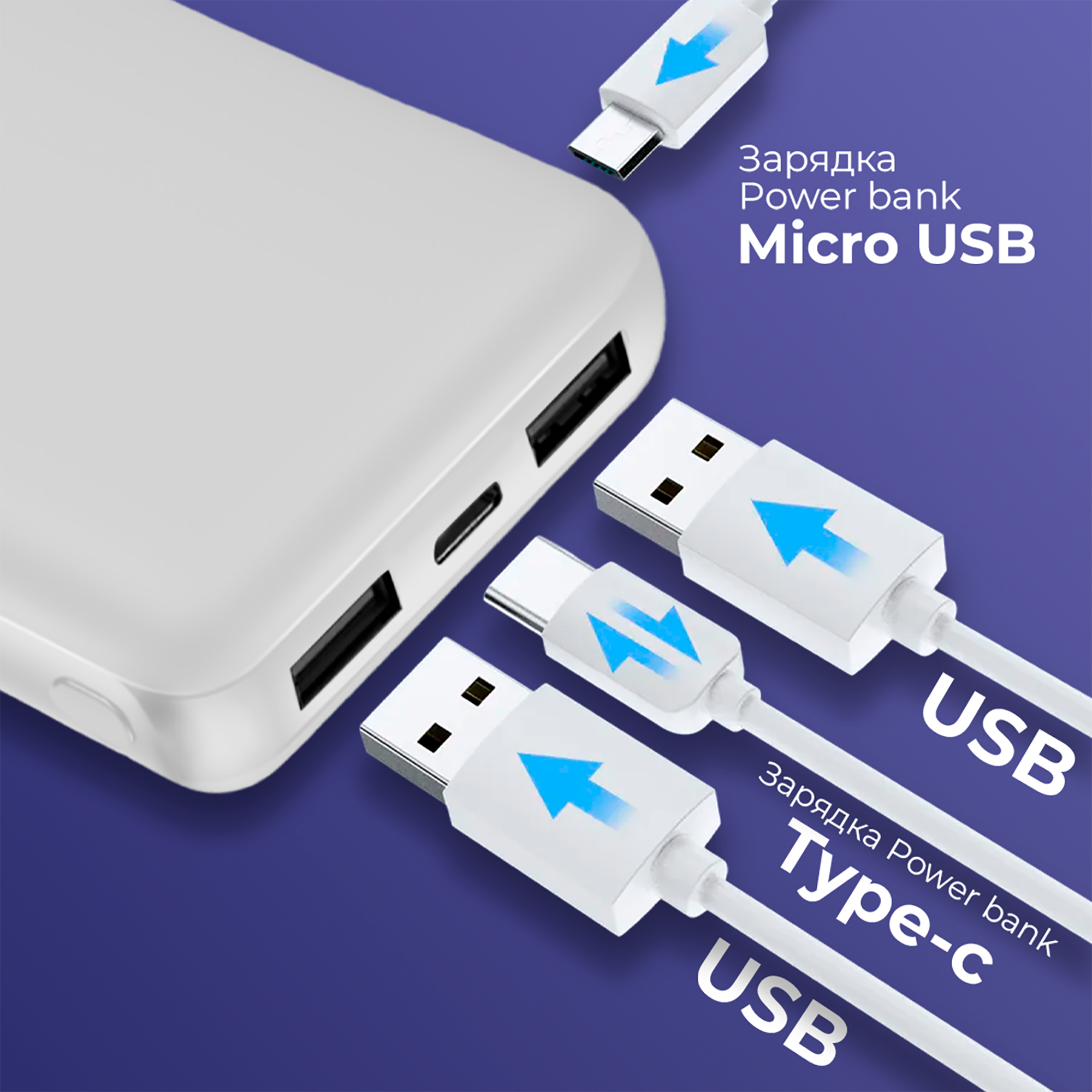 Портативный внешний аккумулятор 10000 mAh, разъемы Type-C, microUSB, USB*2, WALKER, WB-410, белый / powerbank, power bank на телефон, повербанк, банка