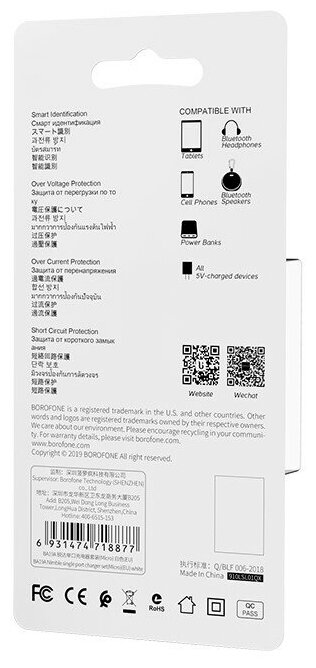 Зарядное устройство BOROFONE BA19A один порт USB, кабель Micro USB, 5V, 1.0A, white 6931474718877