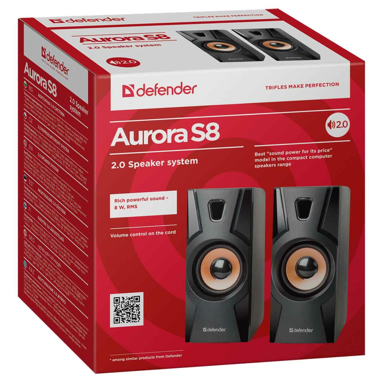 Лучшие цены. Колонки Defender Aurora S8 позволят наслаждаться объёмным и чистым звуком без помех и искажений. Они компактны, поэтому не займут много места. Их можно размещать на любой горизонтальной поверхности. возможности Каждая колонка обладает мощностью 4 Вт, что обеспечивает достаточную громкость. Расширенный низкочастотный диапазон не искажает басы и не портит впечатления от прослушивания. конструкция Корпуса выполнены из надёжного и прочного пластика. Регулятор громкости находится на кабеле. Магазины в вашем городе.