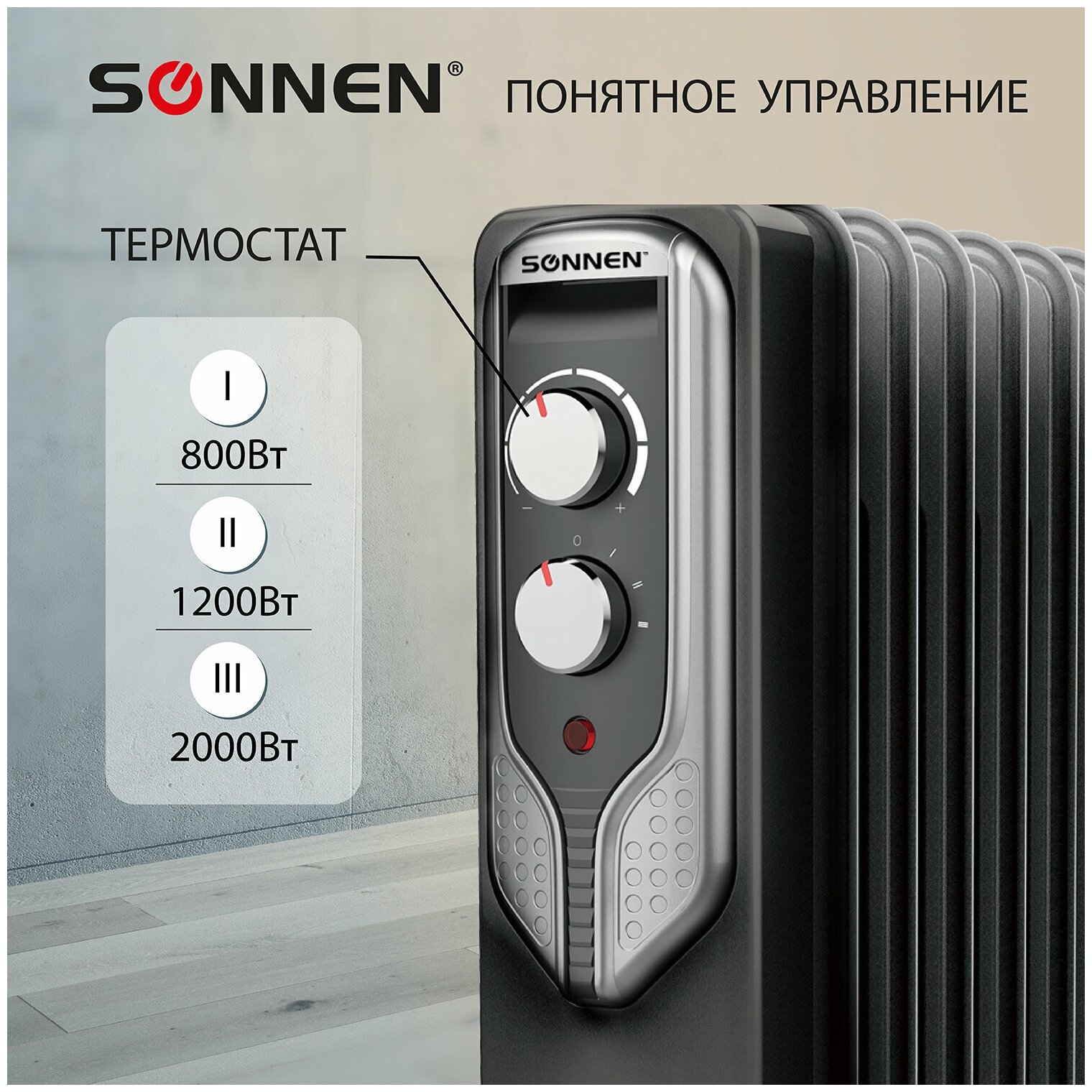 Обогреватель масляный SONNEN DFN-09BL, 2000 Вт, 9 секций, черный, 455311 В комплекте: 1шт.