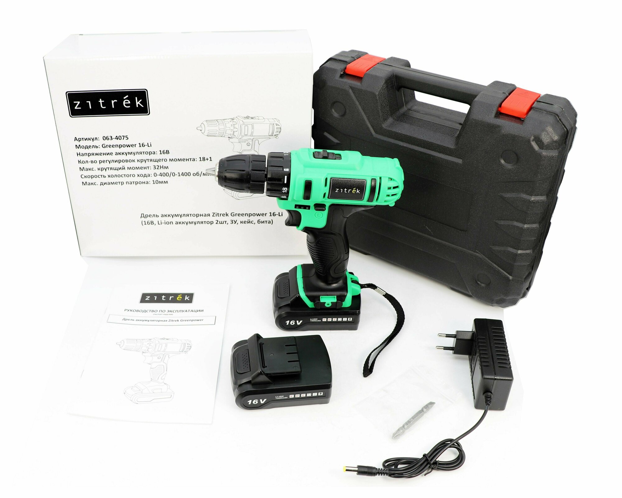 Дрель аккумуляторная Zitrek Greenpower 16-Li { 16В, Li-ion аккумулятор 2шт, ЗУ, кейс, бита }
