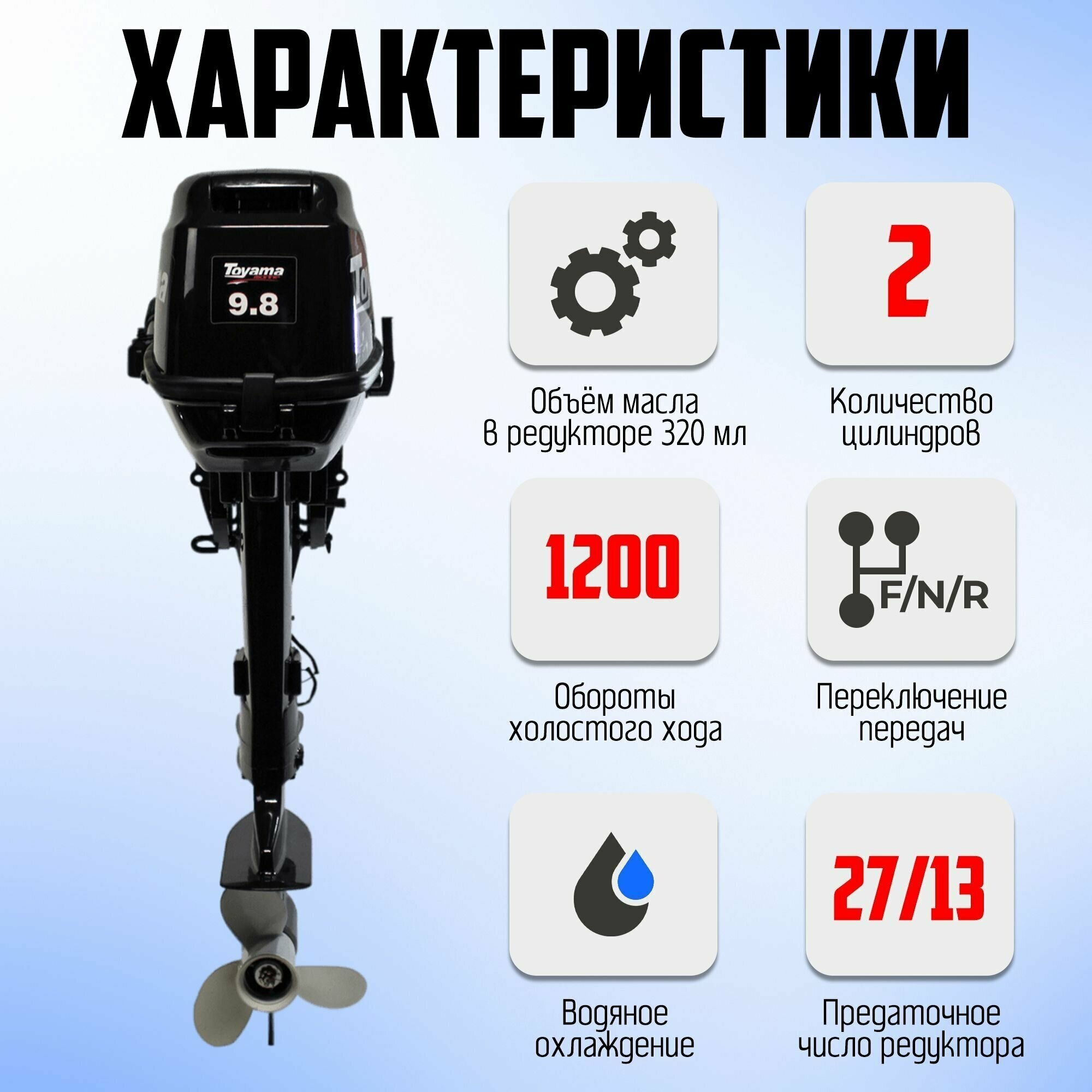 Лучшие цены. Подвесной лодочный мотор TOYAMA T9.8BMS отличается низким уровнем шума при работе, простотой и надежностью. Облегчает передвижение легкой, небольшой лодки по воде. Обладает двухтактным мотором и развивает мощность в 9.8 лошадиных сил. Румпельный тип управления позволяет использовать только одну руку. Лодочный мотор имеет три передачи, что позволяет лишний раз не поворачивать двигатель. Особенности TOYAMA T9,8BMS Простой запуск Ручной стартер обеспечивает простой и быстрый запуск TOYAMA T9.8BMS. Магазины в вашем городе.