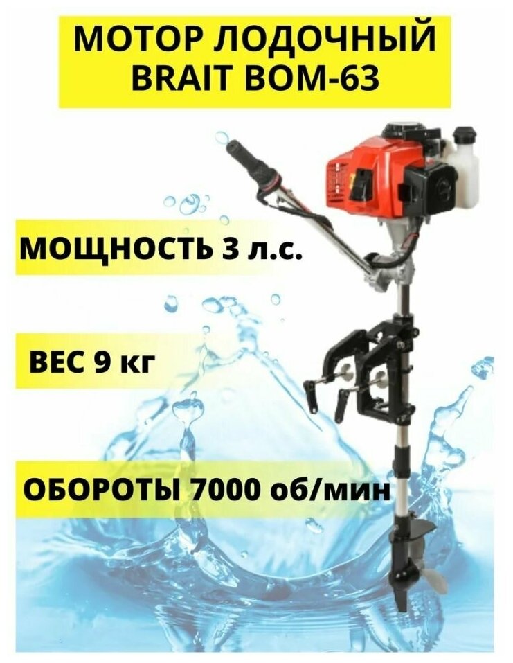 Лучшие цены. Лодочный мотор Brait ВОМ-63 используется как навесное оборудование для лодок. Лодочный подвесной мотор - это бензиновый, двухтактный агрегат для установки на небольших лодках. Станет прекрасным вариантом для любителей рыбной ловли. Устройство легко запускается и управляется, газ регулируется с помощью ручки (как на мотоциклах). Имеет достаточный объем топливного бака для продолжительной работы. Магазины в вашем городе.