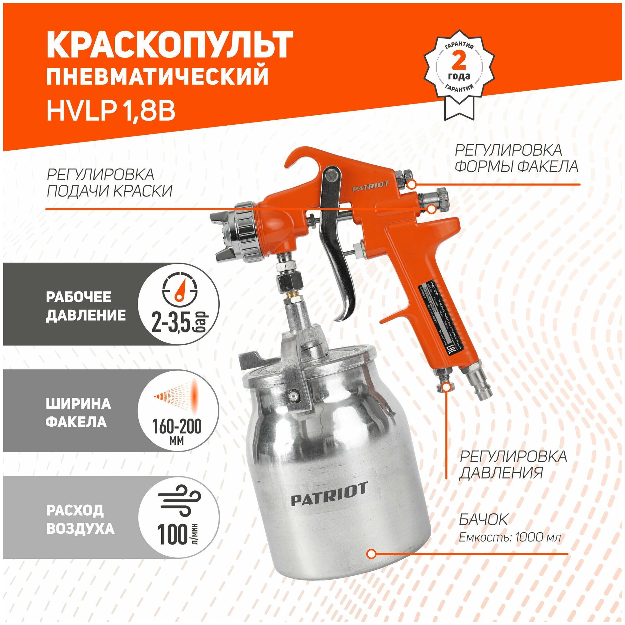 Пневмокраскораспылитель PATRIOT HVLP 1,8B / Краскораспылитель с бачком / Краскопульт пневматический