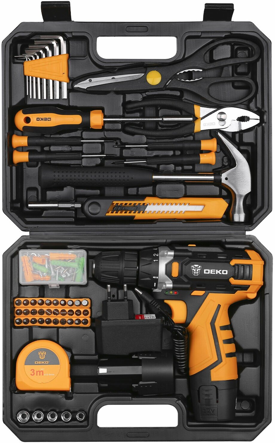 Дрель-шуруповерт аккумуляторная DEKO DKCD12FU-Li 2*12В 1.5Ач Li-Ion, набор инструментов 104 предмета