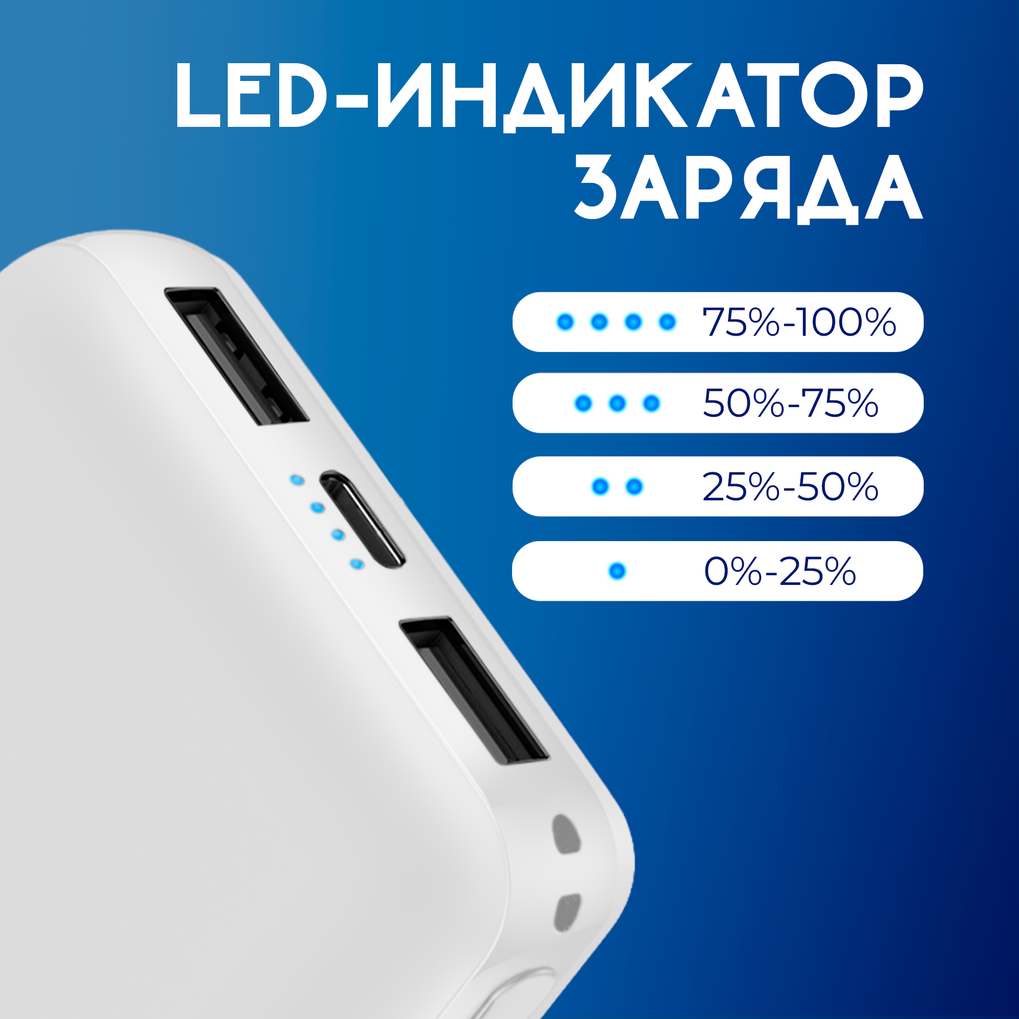 Лучшие цены. Внешний аккумулятор Power Bank 5000mAh, WALKER WB-305 - это портативная зарядка для вашего смартфона, планшета или другого устройства. Он обладает емкостью 5000 мАч, что достаточно для полной зарядки любого современного устройства. Специальная многоступенчатая система защиты обеспечивает безопасность использования в любых условиях. Power Bank имеет 2 входа USB-A и вход USB Type-C и позволяет заряжать устройства любых типов. LED-индикация подскажет оставшийся уровень заряда. Магазины в вашем городе.