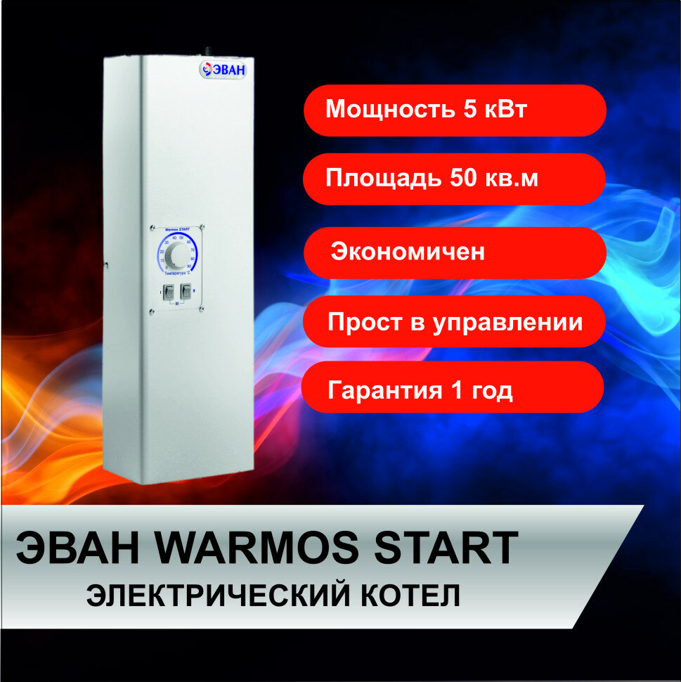 Лучшие цены. Котел электрический Эван Warmos Start 5 является стационарным отопительным прибором и предназначен для обогрева жилых, бытовых и производственных помещений. Прибор может применяться совместно с другими источниками теплоснабжения в качестве основного или резервного. Прибор предназначен для эксплуатации в помещениях с естественной вентиляцией при температуре окружающего воздуха от +40 до -45 оС и относительной влажности воздуха до 98%. Магазины в вашем городе.
