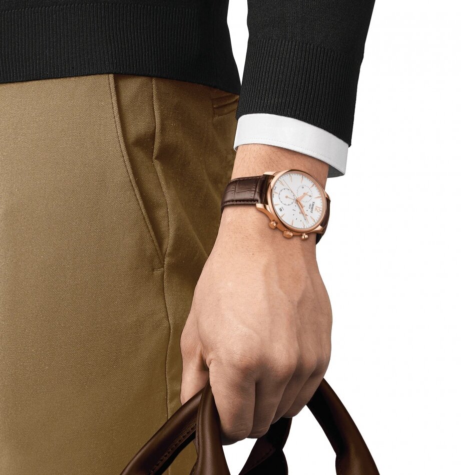 Лучшие цены. Мужские швейцарские часы Tissot- (Тиссот), T-Classic, Tradition, T063.617.36.037.00. Кварцевые мужские часы с хронографом. Хронограф- отмеряет определенный промежуток времени. Кварцевый механизм ETA C10.211, корпус часов выполнен из нержавеющей стали устойчивой к царапинам 316L+PVD покрытие, цвета розового золота, диаметр циферблата 42мм, цвет циферблата- белый. Счетчик даты на циферблате, сапфировое стекло которое не царапается. Водонепроницаемость 3b, (30м). Магазины в вашем городе.