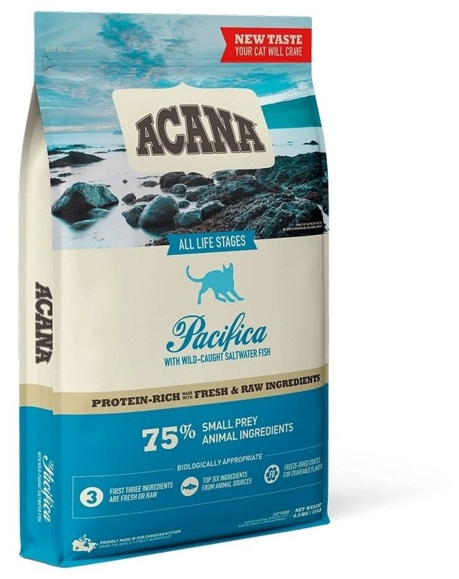 Лучшие цены. Не содержащий растительного белка корм ACANA Pacifica на 70% состоит из рыбы. 1/2 рыбы в кормах ACANA — свежая и цельная, а 1/2 — высушенная или добавленная в виде жира. Вся рыба признана пригодной для употребления в пищу человеком. Корм ACANA Pacifica содержит пять видов выловленной на воле рыбы в соотношении WholePrey — сочетании мышечной ткани, внутренностей и хрящей. Тихоокеанская сельдь — цельная и свежая из чистых озёр Канады. Тихоокеанская сардина — цельная и свежая из чистых озёр Канады. Магазины в вашем городе.
