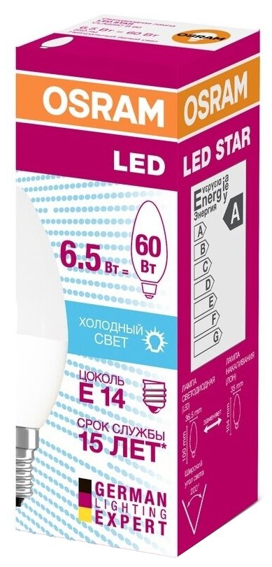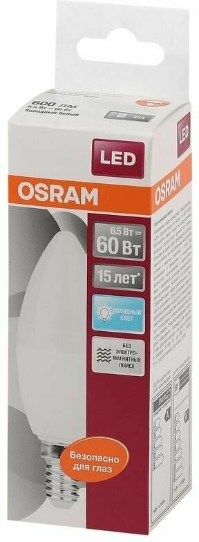 Лампа OSRAM LED Star E14 свеча B C37 6.5Вт, светодиодная LED, 550 лм, эквивалент 60Вт, нейтральный свет 4000К