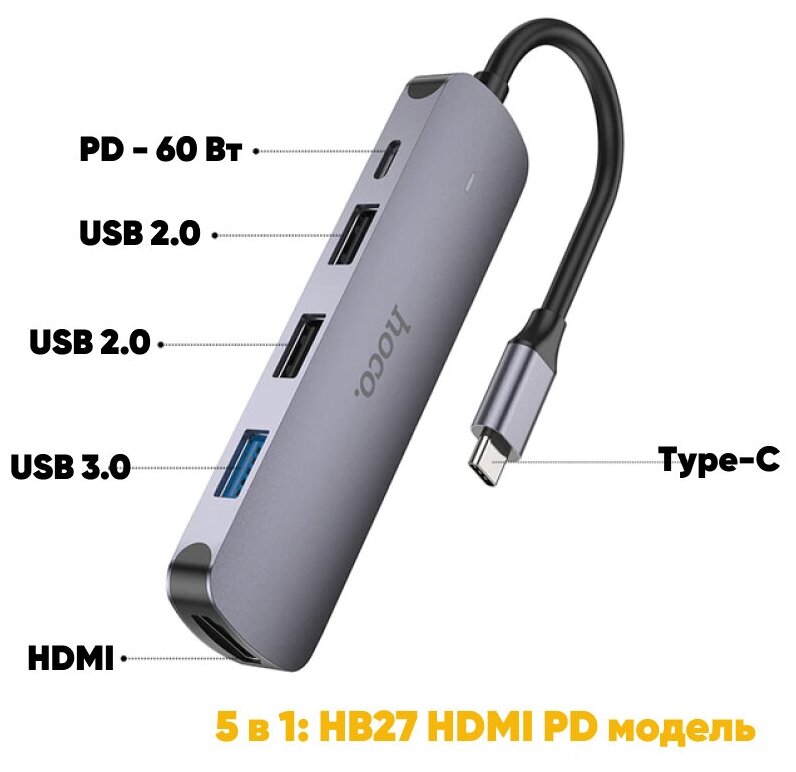 Hoco HB27/ Type-C хаб 5в1 (USB-C + 2 x USB2.0 + USB3.0 + HDMI) хаб для MacBook Apple и Windows