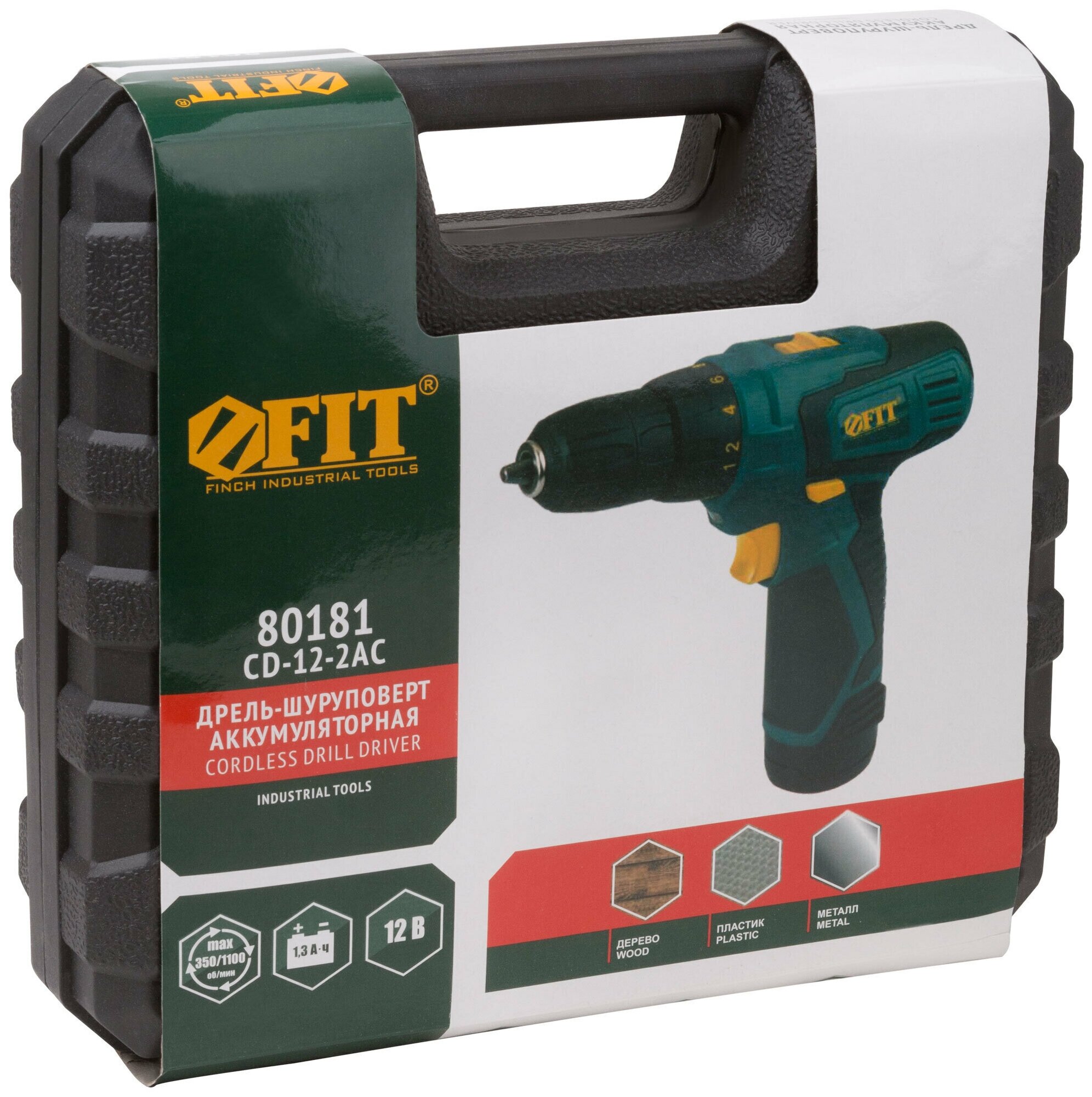Дрель-Шуруповерт акк. 12,0 В; 0-350/1100 об/мин; 20,0 Нм; 2 (Li-Ion) 1,3 Ач; 1 ч.; рез. накл.; кейс, FIT 80181 (1 шт.)