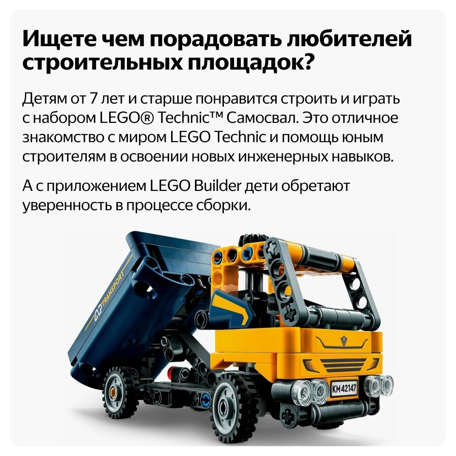Лучшие цены. Ищете чем порадовать любителей строительных площадок? Детям от 7 лет и старше понравится строить и играть с набором LEGO® Technic™ Самосвал (42147). Это отличное знакомство с миром LEGO Technic и помощь юным строителям в освоении новых инженерных навыков. А с приложением LEGO Builder дети обретают уверенность в процессе сборки. Детям в конструкторских ролевых играх понравится водить игрушечный самосвал по воображаемой строительной площадке, а затем поднимать самосвал, чтобы выгрузить груз. Магазины в вашем городе.