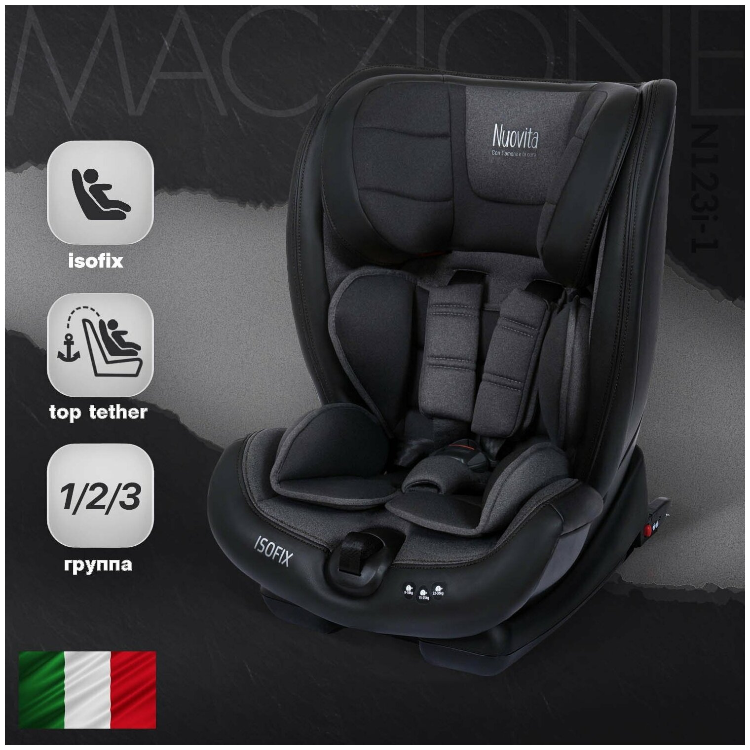 Автокресло Nuovita Maczione N123i-1 (Nero/Чёрный) Группа: 1/2/3 – от 9 месяцев до 12 лет (вес 9-36 кг)