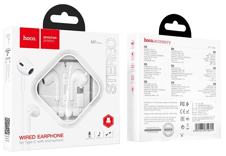Наушники внутриканальные HOCO M1, Max, Type-C, цвет: белый