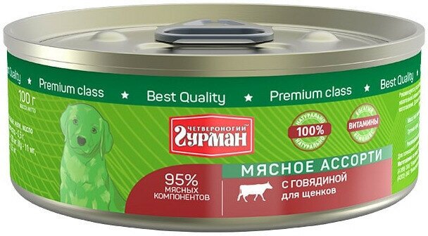 Корм для собак Корм консервированный для щенков Четвероногий Гурман "Мясное ассорти с говядиной", упаковка 24 шт х 100 г