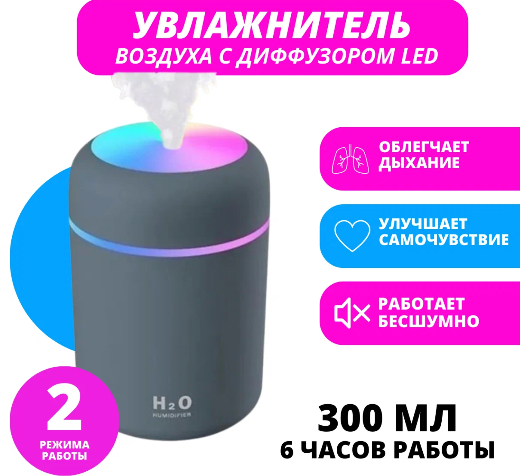 Мини-увлажнитель воздуха С подсветкой HUMIDIFIER H2 О