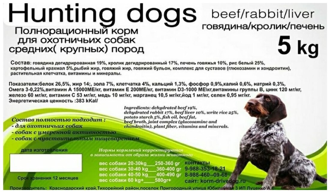 Корм для собак DRIVE DOG Hunting dogs полнорационный корм для охотничьих собак средних и крупных пород говядина с кроликом и печенью (5 кг)