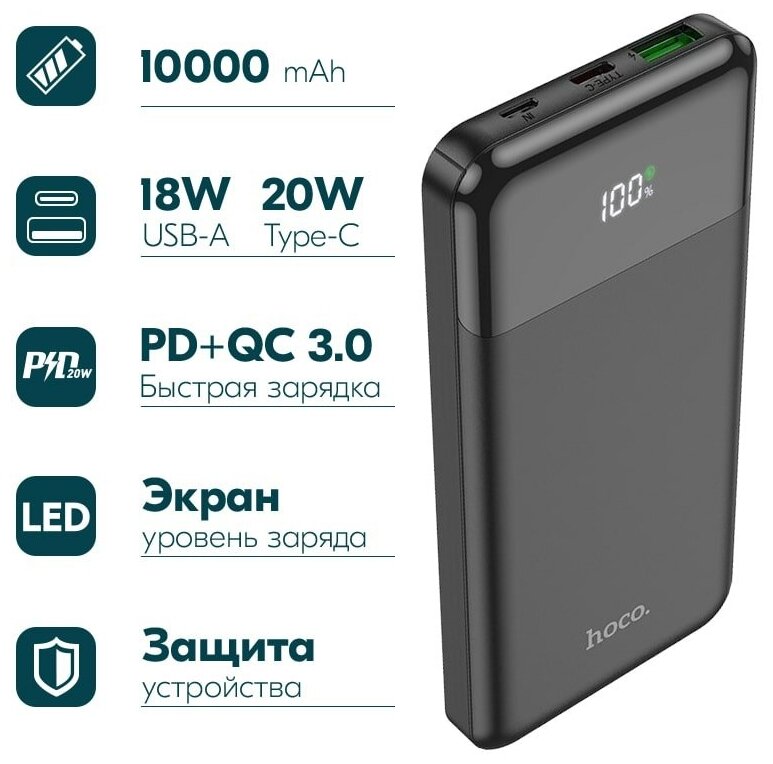 Powerbank Внешний аккумулятор HOCO J102 10000 mAh 20W "быстрая зарядка" черный