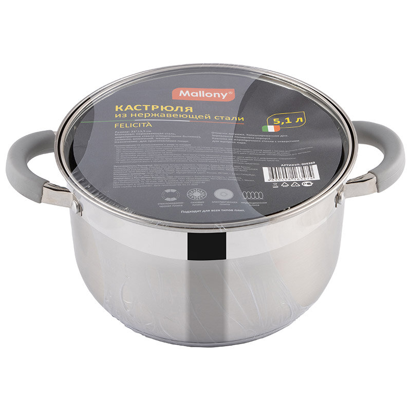 Кастрюля Mallony Felicità из нерж стали с крышкой из жаропроч стекла 5,1л