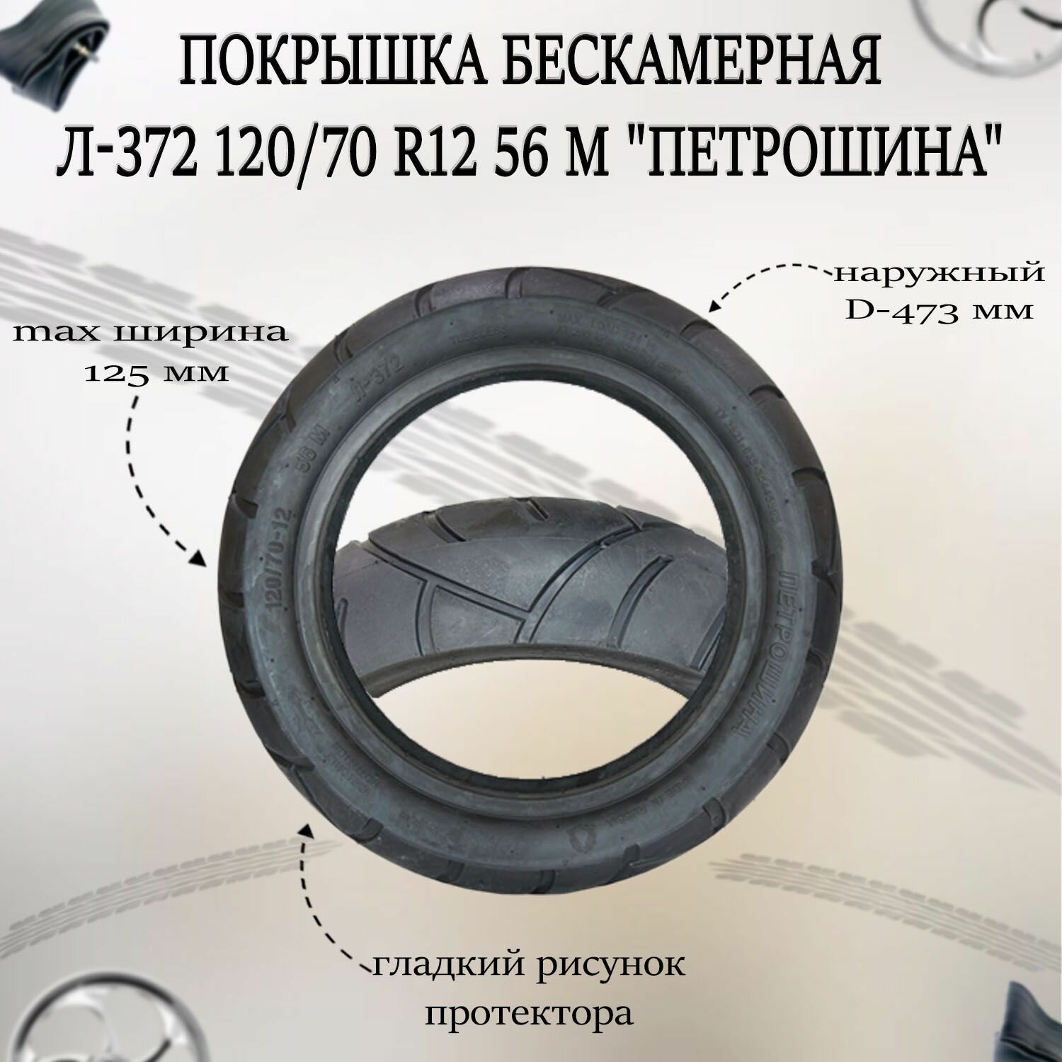 Лучшие цены. Шина бескамерная Петрошина Л-372 120/70-12 для скутера. Используется в городских и пригородных условиях является долговечной, безопасной и комфортной даже в условиях сырого дорожного покрытия. Наружный диаметр покрышки - 473 мм. Максимальная ширина шины - 125 мм. Максимальная нагрузка - 224 кгс. Максимальная скорость - 130 км/ч. Давление соответствующее максимальной нагрузке - 0.25 МПа. Магазины в вашем городе.