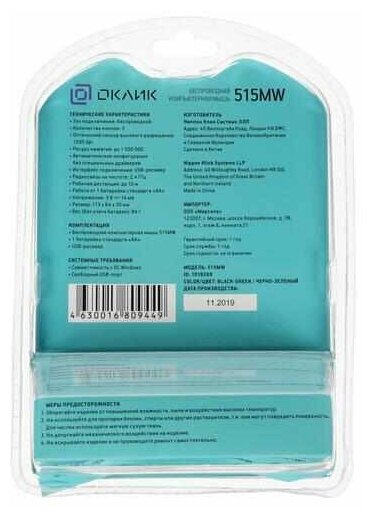 Мышь Оклик 515MW черный/зеленый оптическая (1000dpi) беспроводная USB для ноутбука (3but)
