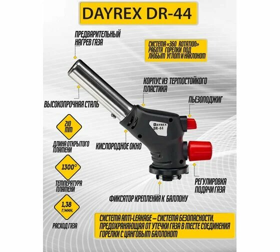 Горелка газовая DAYREX, DR-44 длина пламени 17см, пьезоподжиг, с-ма «360°rotation",с-ма Anti-Leakage