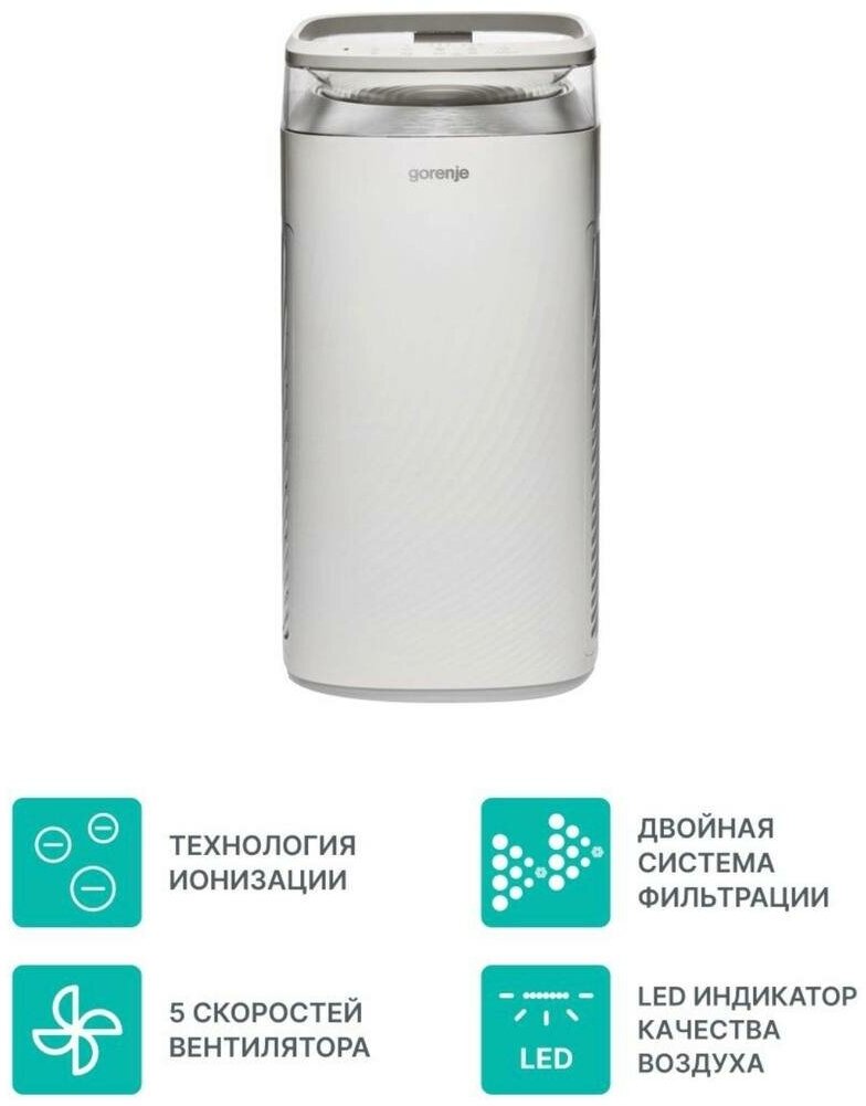 Лучшие цены. С напольным воздухоочистителем Gorenje AP500 в помещении площадью до 60 кв. м. будет по-настоящему приятно дышать. И всё благодаря многоступенчатой фильтрации, наличию встроенного ионизатора и нейтрализатора табачного дыма. Также модель можно использовать в качестве вентилятора. Невероятно тихая работа-25дБ. При минимальной скорости вентилятора и выключенной подсветке очиститель работает практически бесшумно и не напоминает о себе. Магазины в вашем городе.