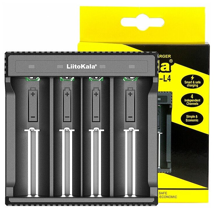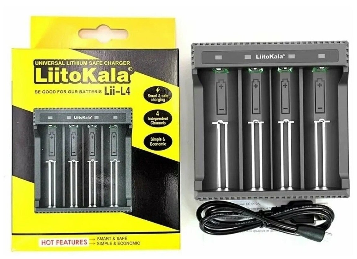 Лучшие цены. LiitoKala Lii-L4 – это зарядное устройство для зарядки Li-ion аккумуляторов, не подходит для зарядки аккумуляторов другого типа. Характеристики: - Входное напряжение 5В 2А - Может питаться от сетевого или автомобильного зарядного устройства - Ток заряда 500mA - Выходное напряжение 4.2В - 4 независимых слота - Защита от короткого замыкания, от перегрузки по току, защита от неправильной полярности - Размеры: 100 х 100 х 30мм - Светодиодный индикатор для отображения процесса зарядки - Подходит для всех типов. Магазины в вашем городе.