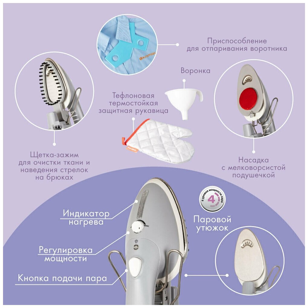 | Комплектация | мини утюжок, зажим для брюк, телескопическая стойка, стакан и лейка для залива воды, защитная перчатка |