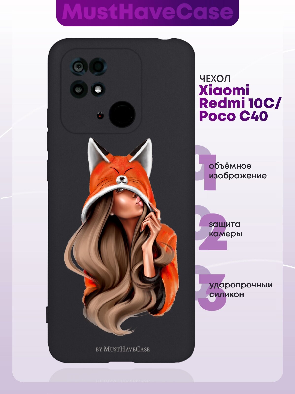 Чехлы для мобильных телефонов Черный силиконовый чехол для Xiaomi Redmi 10C/ Poco C40 Foxy Girl/ Лисичка для Сяоми Редми 10С