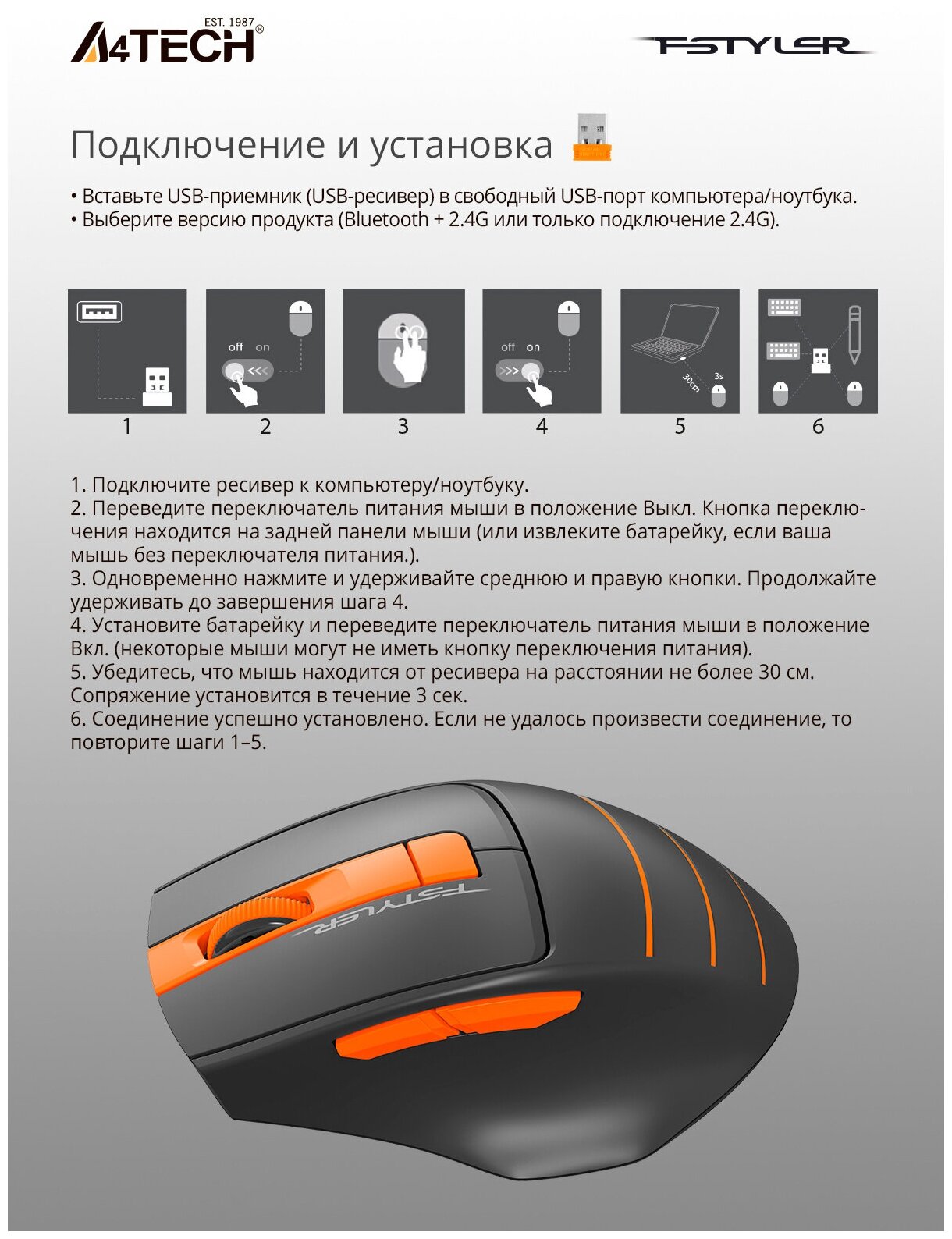 Лучшие цены. Модель FG30 Бренд A4TECH PartNumber/Артикул Производителя FG30 ORANGE Дизайн для правой руки Радиус действия мыши 15 Технология оптическая Подключение по USB ДА Размеры мыши 70x105x42мм Вес (мыши) 76 Тип соединения мыши беспроводная Разрешение сенсора, макс. 2000 Изменение чувствительности сенсора кнопкой ДА Количество кнопок 6 Колесо прокрутки ДА Тип Мышь Тип беспроводного соединения мыши Радио Длина упаковки (ед) 0.21 Ширина упаковки (ед) 0.13 Высота упаковки (ед) 0.08 Габариты упаковки (ед). Магазины в вашем городе.