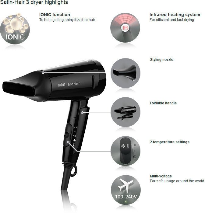 Лучшие цены. Мощность: 1600 Вт. Ионизация. Инфракрасная система нагрева. Регулировка воздушного потока: 1. Регулировка температуры: 2. Концентратор. Петелька для подвешивания. Складная ручка. Поддержка напряжения разных стандартов. Цвет черный. Магазины в вашем городе.