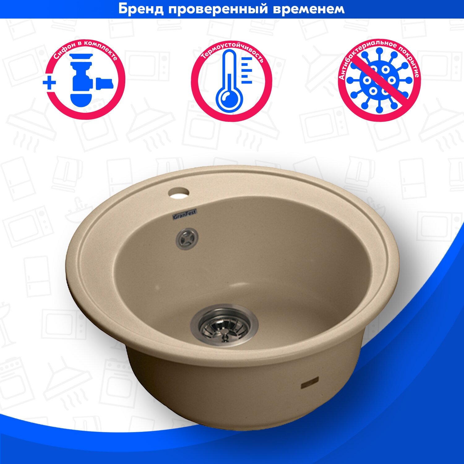 Мойка для кухни врезная каменная GranFest GF-R510, цвет песочный, круглая, 505х508х200 мм