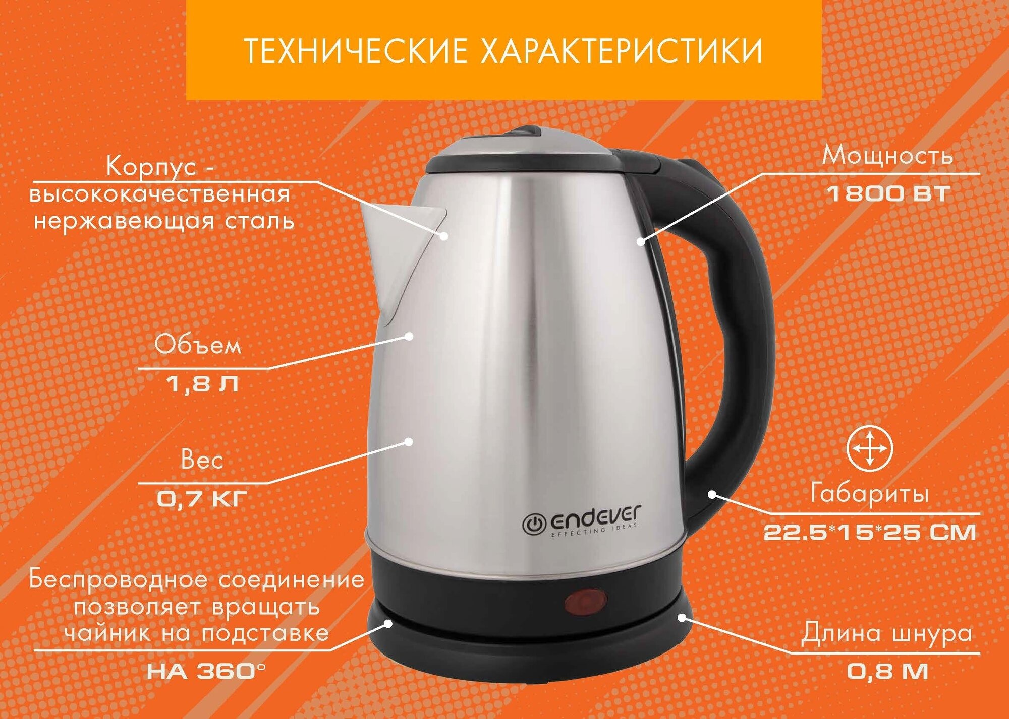 Лучшие цены. Чайник электрический, модель Endever Skyline KR-229S, емкость-1,8л, матовый стальной корпус, черная ручка, дисковый нагревательный элемент, мощность 1800 Вт, напряжение 220В, 12 шт/уп. Магазины в вашем городе.